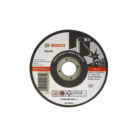 Tiesus pjovimo diskas Expert, skirtas Inox - Rapido 115x22x1,0 mm 2608600545 Aukštos kokybės pjovimo diskai nerūdijančiajam plienui (Inox). Skirti rankiniams kampiniams šlifuokliams. Didžiausias periferinis greitis 80 m/s (priklausomai nuo maksimalaus greičio ir disko skersmens). Fe/S/Cl < 0,1 %. Techniniai duomenys: - Aprašymas: AS 60 T INOX BF - Skersmuo D: Dydis: 115,0 mm - Gręžinio skersmuo d: 22,23 mm - Storis b: 1,0 mm.