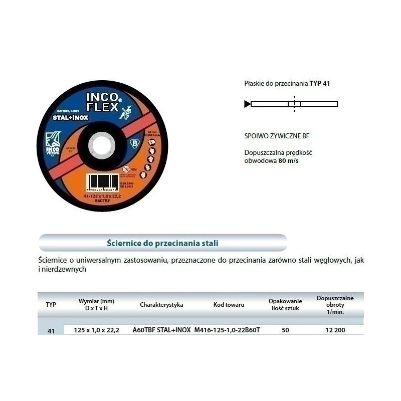 M416-125-1,0-22A60T METALINIS DISKAS INCOFLEX 125*1,0 PLIENAS+INOX .