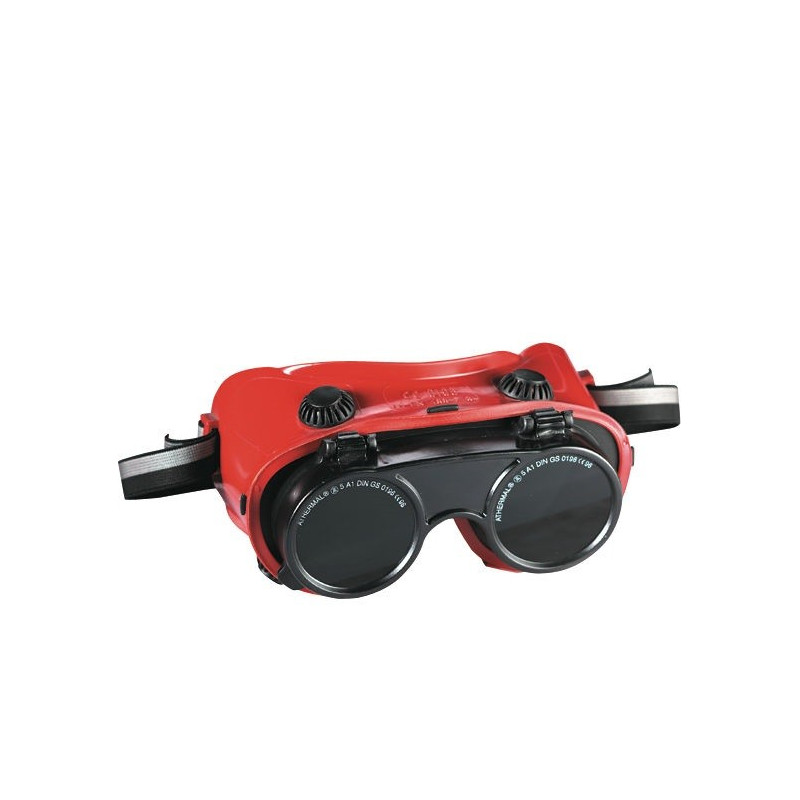 - PVC rėmelis: 3 4 - Pakeliamas stiklinis lęšis - 5 mm storio šlifuotas skaidrus lęšis: 1 S - Juodas lęšis 5 din, storis 5mm:1, lęšio filtras EN 169 5 - 4 ventiliacijos vožtuvai - Elastinė juosta - Standartas: EN 166