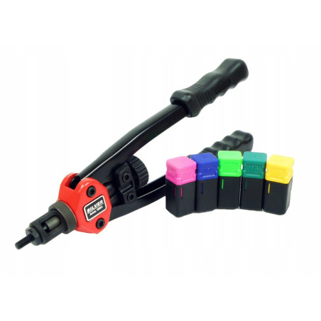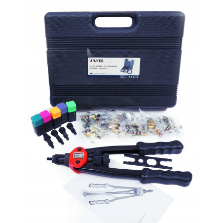 M5 - M12 kniedijimo staklės iš SILVER. Kniedijimo staklės turi penkių dydžių galvutes: Į komplektą taip pat įeina M5, M6, M8, M10, M12 kniedžių veržlės (po 10 vnt.).Techniniai duomenys: - ilgis: 330 mm - sriegio žingsnis: 8 mm - galvutės medžiaga: chromo-molibdeno plienas.