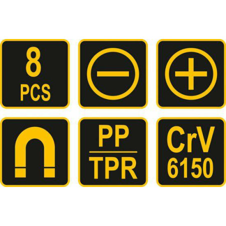 Produkto aprašymas Pagamintas iš aukštos kokybės medžiagų. Patvarus CrV 6150 plienas ergonomiškos, neslystančios PP ir TPR plastiko rankenos atsuktuvai: plokšti: 6,5 x 38, 3,0 x 75, 5,5 x 75, 5,5 x 75, 6,5 x 100 mm kryžminiai: PH2 x 38, PH0 x 75, PH1 x 75, PH2 x 100 mm