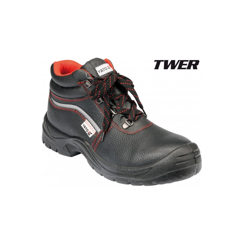 TWER S3 darbo batai - kulkšnies batai - batų viršus pagamintas iš natūralios odos, atsparus vandeniui - priekinėje batų dalyje padas dengia kulkšnį, kad batų galas nenusidėvėtų - metaliniai raištelių laikikliai leidžia surišti batus jų nepažeidžiant - padas pagamintas iš poliuretano, atsparus alyvai, kulnas - kulno kaušelis apsaugo pėdą nuo aštrių daiktų sukeltų dūrių iki 1100 N - plieninis piršto antgalis atlaiko 200 J smūgio jėgą ir lenkimą iki 15 kN - apsaugos kategorija S3, atitinka EN20345 standarto reikalavimus.