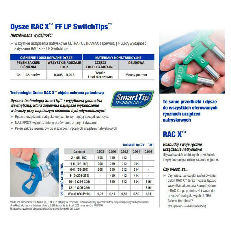 Patentuota "SmartTip" technologija "Graco RAC X" antgaliai, kurių unikali vidinė geometrija leidžia užtikrinti geriausią pramonėje apdailą net ir purškiant beoriu būdu, esant mažam slėgiui! Galima purkšti iki 50 % mažesniu slėgiu Nėra perteklinio purškimo Lengviau užtepti persidengiančius raštus Sutrumpintas paruošimo ir valymo laikas Iki 2 kartų ilgesnis tarnavimo laikas