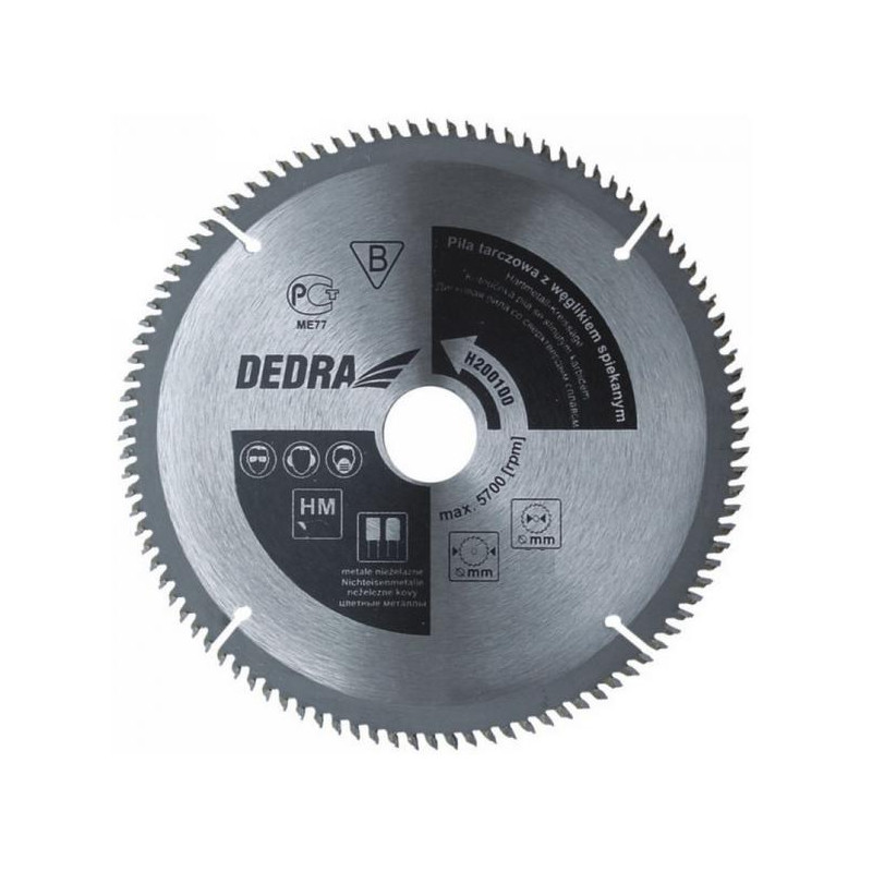 DEDRA H250100 250 mm skersmens diskinis pjūklas su karbidu (HM) spalvotiesiems metalams - skirtas aliuminiui pjauti.TECHNINIAI DUOMENYS: Geležtės skersmuo: Disko skersmuo: 250 mm: Dantų skaičius: 100 Maksimalus aps: Maksimalus našumas: 4600 aps/min.
