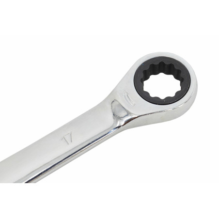 Su 72 dantukais ir 5° reketiniu judesiu užtikrina didelį sukimo momentą ir prieinamumą. Aiškios dydžio žymos greitam identifikavimui. Tinka atlaisvinti ir priveržti sriegines jungtis. Būtinas remonto ir techninės priežiūros darbams. Techniniai duomenys: Dydis: 17 mm Svoris: 240 g.