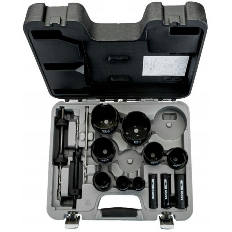 W zestawie: 2 x uchwyt, zapasowe wiertło prowadzące, otwornice o rozmiarach 19, 22, 25, 32, 35, 38, 44, 51, 57, 68 oraz 76 mm