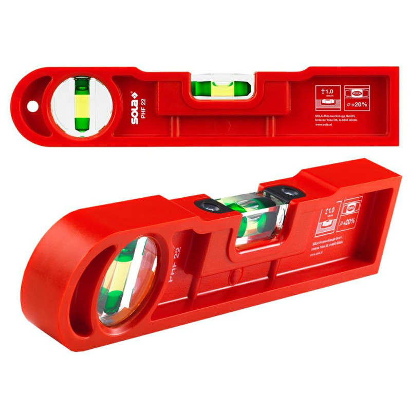 Torpedinis gulsčiukas SOLA PHF 22 - Kompaktiškas, lengvas ir patogus - Atsparus vandeniui, karščiui ir šalčiui - Vamzdiniai buteliukai iš akrilo stiklo, atsparūs mechaniniams pažeidimams Techniniai duomenys: Medžiaga: ABS plastikas Spalva: raudona Horizontalių buteliukų skaičius: 1 vertikalių buteliukų skaičius: 1 vertikalių buteliukų skaičius: Matavimo paviršius: ABS plastikas