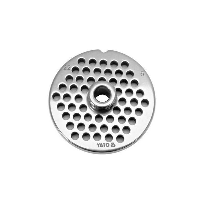 Produkto aprašymas Mėsmalės ekranas YG-03235 - skylės skersmuo: skersmuo: 6 mm - sieto skersmuo: 81,5 mm - ašinės skylės skersmuo: 11 mm - storis: 25 mm - medžiaga: nerūdijantis plienas.