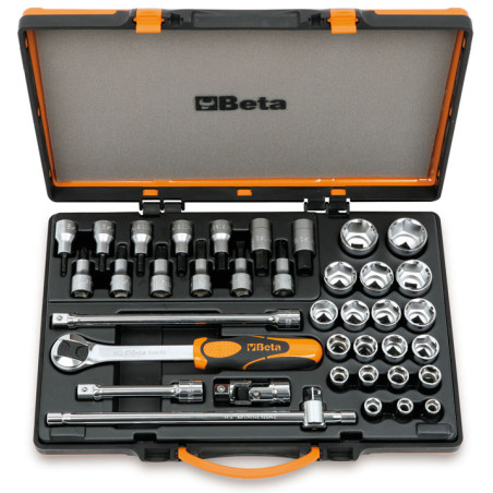 33 1/2" šešiakampių lizdų rinkinys su priedais Beta 920B/C33 Rinkinį sudaro: 1. 1/2" šešiakampių lizdų Beta 920B dydžiai: 10 - 11 - 12 - 13 - 14 - 15 - 16 - 17 - 18 - 19 - 20 - 21 - 22 - 23 - 24 - 26 - 27 - 28 - 30 - 32 mm 2. Dydžiai: 1,2x8 - 1,6x9 - 2x12 mm 3. 1/2" lizdai su Phillips® atsuktuvo antgaliais Beta 920PH Dydžiai: PH2 - PH3 - PH4 4. Dydžiai: 4 - 5 - 6 - 8 - 10 - 12 - 14 mm 5. 1/2" lizdo prailgintuvas Beta 920/21 - ilgis: 125 m 6. 1/2" lizdo prailgintuvas Beta 920/22 - ilgis: 255 mm 7. 1/2" lizdo šarnyras Beta 920/25 8. 1/2" išstumiama pavaros rankenėlė Beta 920/42 9. 1/2" dvigubo veikimo reketas Beta 920/55