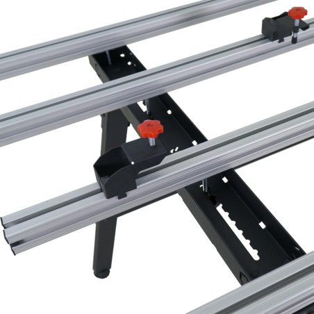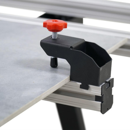 CeraM?X 1200 plytelių klijuotojų stalas yra gerai apgalvotas plytelių klijuotojo darbo vietos organizavimo sprendimas. - Stalas greitai perkeliamas iš transportinės padėties į darbinę - Turi konfigūruojamą kreipiamųjų strypų padėtį. - Stabdžių užraktai patikimai fiksuoja plyteles. - Išilginiai strypai ant stalo kojų leidžia kloti bet kokią lakštinę medžiagą (plyteles, gipskartonio plokštes, fanerą ir pan. ) ir sukurti patogią lentyną įrankiams laikyti.Magnetiniai spaustuvai leidžia pagerinti įrankių laikymo ergonomiką - Papildomi laikikliai leidžia patogioje padėtyje pastatyti plunksninį įrankį, gulsčiuką ir t. t. - Kojos turi atlenkiamas atramas, užtikrinančias saugią stalo padėtį Stalas skirtas apdirbti vidutinio dydžio plyteles iki 1200 mm. Išardyto stalo gabaritiniai matmenys yra 1300*780*930 mm, o surinkto - 1300*775*245 mm. Stalo svoris - 24 kg.