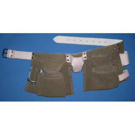 Odinis stogo dengimo diržas iš 1,8-2,0 mm storio karvės velveto odos Vienetinis, labai patvarus, dvigubai susiūtas ir sukniedytas, su kišenėmis ir įrankių laikikliais Tvirtinimo dirželis ir priedai iš 3,5 mm storio blanširuotos odos Svoris: 950 g