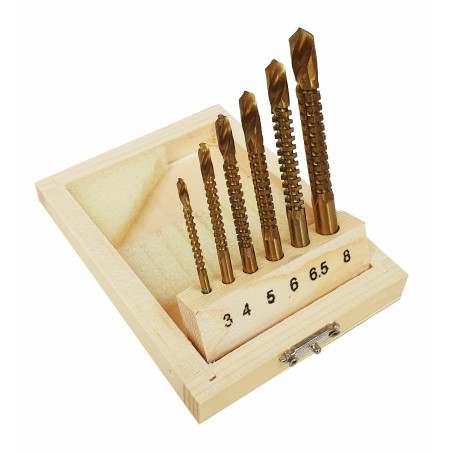 Šešių dydžių frezavimo grąžtų rinkinys: 3, 4, 5, 6, 6,5, 8 mm.