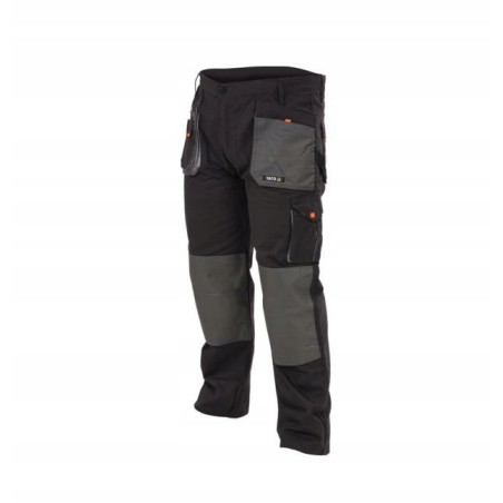 Darbo kelnės, M dydis; medžiaga: 35% medvilnė, 65% poliesteris; svoris: 267 g / m 2; jos papildomai sutvirtintos trigubomis siūlėmis pažeidžiamose vietose; daugiafunkcinės kišenės; su specialia kišene išmaniajam telefonui; papildomas sutvirtinimas iš oksfordo audinio, įsiūtas kelių lygyje, skirtas įdėti apsauginius įdėklus - kelių pagalvėles (o