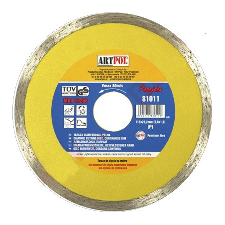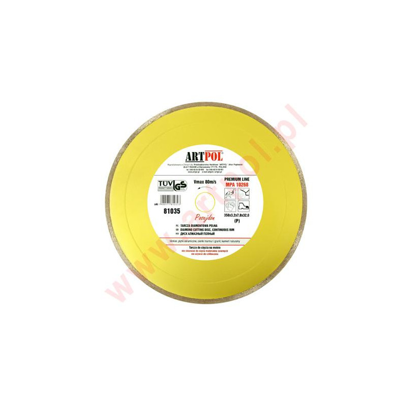 Nepertraukiamai naudokite tik vandenį arba aušinamojo tepalo emulsiją. Priešingu atveju gali būti pažeistas diskas. Naudojant specialias emulsijas (pvz., vandenį su pilkuoju muilu arba gręžimo alyvą), pjovimo našumas papildomai padidėja iki 25 %, palyginti su vandeniu kaip aušinamuoju skysčiu. NAUDOJIMAS: KLINKERIS, KERAMIKINĖS PELYTĖS, TERAKOTAS, PLONAS MARMURAS IR GRANITAS, NATŪRALINIS AKMENIS Skylės dydis 32/25,4/22,2m
