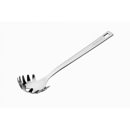 SOLID plieninis makaronų šaukštas turi skylę rankenoje, todėl jį galima patogiai pakabinti, pavyzdžiui, virtuvėje ant turėklo. Kadangi šis aksesuaras yra labai universalus, jis puikiai dera daugelyje šiuolaikinių interjerų. Šaukštas puikiai tinka makaronams, ypač ilgiems makaronams, pavyzdžiui, spagečiams, patiekti. Dėl patogių skylučių galite išpilti vandenį ir išimti patiekalą tiesiai iš verdančio vandens į lėkštę.