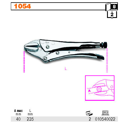 Savaime užsifiksuojančios reguliuojamos replės, tiesios BETA 1054 235MM Techniniai duomenys: Bendras ilgis: 235 mm Didžiausias atstumas: Didžiausias ilgis: 40 mm Reguliuojamas