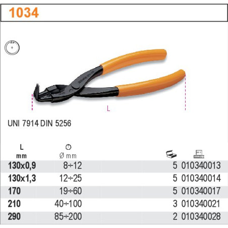 Beta 1034 45° sulenktos vidinio fiksavimo žiedo replės Dviejų kompozitų neslystanti PVC rankena užtikrina didelį patogumą Kaltinis įrankis pagamintas iš aukštos kokybės įrankinio plieno Dydis: 210 mm