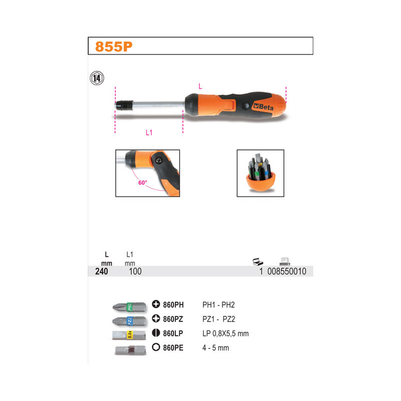 Dvigubo veikimo reketinė rankenėlė Beta 855P atsuktuvo antgaliams.Rankena su šarnyru. Rankenoje telpa septyni atsuktuvų antgaliai. Rankenoje yra šie atsuktuvų antgaliai: 1. Kryžminiai atsuktuvų antgaliai Beta 860PH dydžiai: PH1 - PH2 2. Kryžminiai atsuktuvų antgaliai - Supadriv Beta 860PZ dydžiai: PZ1 - PZ2 3. Plokšti atsuktuvų antgaliai Beta 860LP dydžiai: LP 0.8x5,5 mm 4. Šešiakampiai atsuktuvų antgaliai Beta 860PE dydžiai: 4 - 5 mm - Rankena išlenkta 60 laipsnių kampu, skirta darbui sunkiomis sąlygomis - Nuimama geležtė - atsuktuvo antgalį galima tvirtinti tiesiai rankenoje - 7 atsuktuvų antgaliai rankenoje