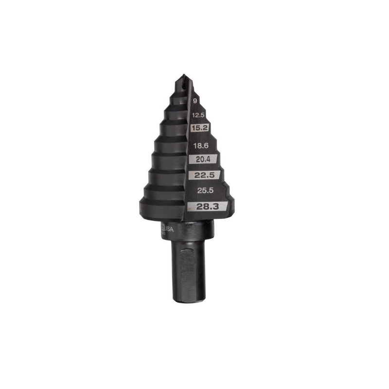 Koto skersmuo (mm) : 10 Bendras ilgis (mm) : 68 Pakopų skaičius : 9 Pakopiniai grąžtai idealiai tinka gręžti šias medžiagas: - Juodojo ir spalvotojo metalo lakštai, profiliai ir vamzdžiai. - Varis, žalvaris ir aliuminis. - Nerūdijantis plienas. - Plastmasės. - Didžiausias medžiagos storis - 4 mm. Rekomenduojama naudoti aušinimo skystį: - Elektros instaliacija: gręžimas plokštėse ir spintose jungtims įrengti. - Hidrauliniai, šildymo, oro kondicionavimo ir vėdinimo įrenginiai: apžiūros skylės. - Apdirbimas ir gamyba: įvairūs skersmenys ir skylių padidinimai. - Automobilių pramonė: skylės kabeliams (mobiliesiems telefonams, antenoms, laidams) montuoti. - Techninė priežiūra ir remontas: įvairūs pritaikymai, skylių didinimas. Žingsninių grąžtų pranašumai prieš įprastus grąžtus: - Vienu grąžtu galima padaryti skirtingo skersmens skyles - Daugiau galimybių ir mažesnis nusidėvėjimas! - Geriausias būdas padidinti esamą skylę. - Šerdis nesukama