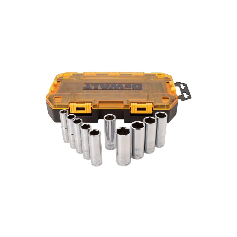 Giluminių lizdų rinkinys 10 el. 1/2 DWMT73815-0 DeWALT - tai antgalių rinkinys, skirtas smūginiams veržliarakčiams ir atsuktuvams su 1/2 colio tvirtinimu (galima naudoti su kitais antgaliais, naudojant atitinkamą adapterį) Patvarus permatomas dangtelis Nuimamas vidinis dėklas Techniniai duomenys DWMT73815-0 DeWALT: Antgalių dydžiai: Korpuso spalva: juoda/geltona Kištukinių lizdų spalva: sidabrinė Rinkinio dalių skaičius: 1 vnt: Rinkinyje yra: 1/2" (col.) gilių perkusinių lizdų dydis 13 1/2" (col.) gilių perkusinių lizdų dydis 14 1/2" (col.) gilių perkusinių lizdų dydis 15 1/2" (col.) gilių perkusinių lizdų dydis 16 1/2" (col.) gilių perkusinių lizdų dydis . 17 Giluminis smūginis lizdas 1/2" (colio) skersmens. 18 Giluminis smūginis lizdas 1/2" (colio) skersmens. 19 Giluminis smūginis lizdas 1/2" (colio) skersmens. 21 Giluminis smūginis lizdas 1/2" (colio) skersmens. 22 Giluminis smūginis lizdas 1/2" (colio) skersmens. 24