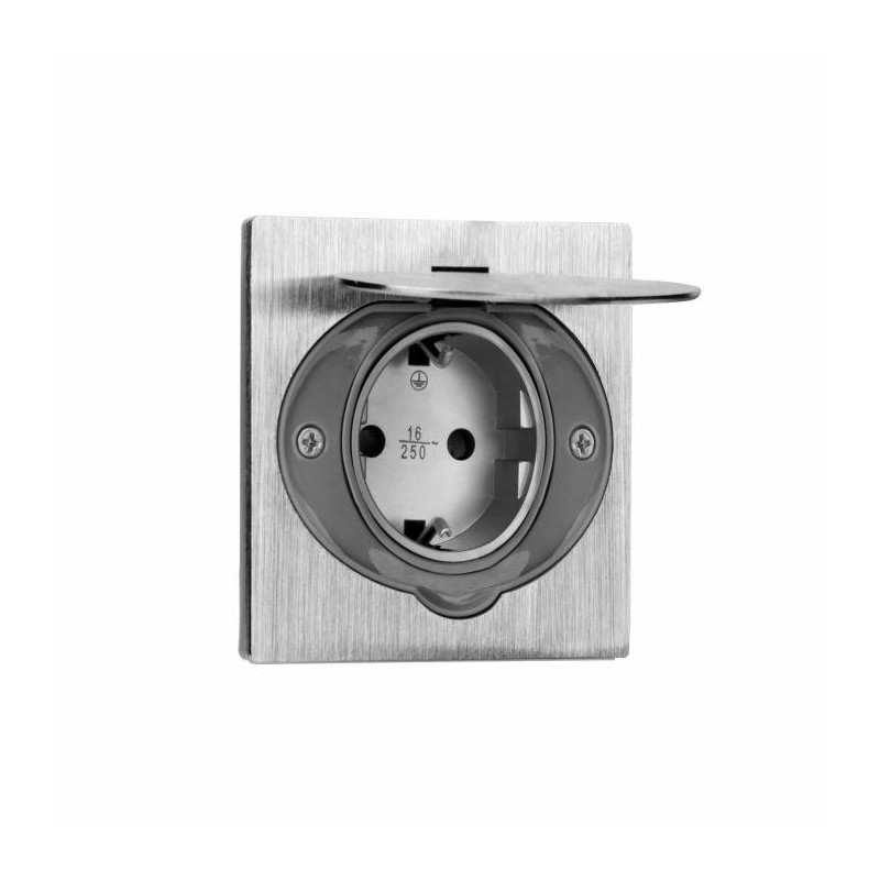 "Schuko" tipo kištukinis lizdas su įžeminimo ir srovės kelio dangteliais hermetiškame korpuse (IP44). Tinka montuoti į standartinę O60 mm elektros dėžutę. Medžiaga: Nerūdijantis plienas. Techninės specifikacijos Bendra informacija: Modelis: Įleidžiamas Aukštis: 86 mm Standartinis kištukinis lizdas: Schuko (F tipas) Maksimali apkrova: 3680 W Kištukinių lizdų su apsauginiu kontaktu (SCHUKO) skaičius: 1 Kitos savybės: Hermetiškas, montuojamas į 60 mm elektros dėžutę Spalva: Nerūdijantis plienas Medžiaga: Nerūdijantis plienas Dažnis: 50 Hz Apsaugos klasė (IP): IP44 Montavimo angos skersmuo: 60 mm Montavimo gylis: 50 mm Plotis: 86 mm Ilgis: 57 mm