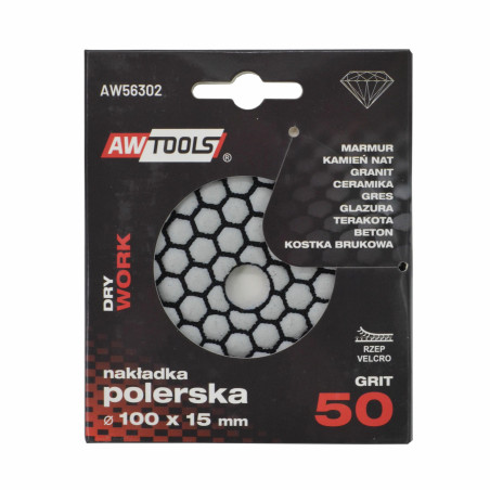 Tinka granitui, marmurui, dirbtiniam akmeniui, uolienų plokštėms, teracui, akmens masės dirbiniams, keramikai, plytelėms, stiklui, betonui poliruoti. Laipsnių diapazonas: G50 - briaunų šlifavimas G100 - briaunų lyginimas po pjovimo G200+ - šlifavimas iki tobulo paviršiaus Techniniai duomenys: Skersmuo: 100 x 15 mm Laipsnis: 50 Maksimalus greitis 3000 aps./min Naudoti: sausai Priedas: velcro Svoris: 40 g