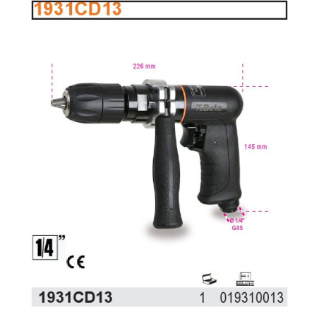 Pneumatinis dvipusis gręžtuvas su 13 mm savisriegiu griebtuvu Beta 1931CD13 Techniniai duomenys: * Atstumas tarp griebtuvo žandikaulių: 1,0÷13 mm * Veleno sriegis: 1/2" 20 UNC * Tuščiosios eigos greitis: 800 rpm * Power: 0.38 kW * Air inlet: * Darbinis slėgis: 1/4" DUJŲ * Darbinis slėgis: 1 / 4" DUJŲ: 6.0 bar * Max. permissible operating pressure: 6,2 bar * Mažiausias vidinis žarnos skersmuo: 6,2 bar * Mažiausias vidinis žarnos skersmuo: 6,2 bar * Didžiausias leistinas žarnos skersmuo: 6,2 bar 10 mm * Oro sąnaudos vidutiniškai: 10 mm * Oro sąnaudos vidutiniškai: 10 mm * Oro sąnaudos vidutiniškai: 10 mm 170 l/min * Didžiausios oro sąnaudos: 230 l/min * Svoris: 1290 g * Bendras ilgis: 226 mm