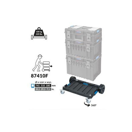 Aprašymas Leidžia patogiai transportuoti šios serijos modulinius įrankių rinkinius. Sustiprinta konstrukcija ir dideli (18 cm) guma padengti užvažiuojamieji ratai, sumontuoti ant metalinės ašies, leidžia įveikti įvairias reljefo kliūtis (pvz., laiptus, rampas). Metaliniai pasukamieji ratai su stabdžiu užtikrina puikų manevringumą ir apsaugo visą komplektą nuo nepageidaujamo judėjimo: Platformos svoris: 4,75 kg.