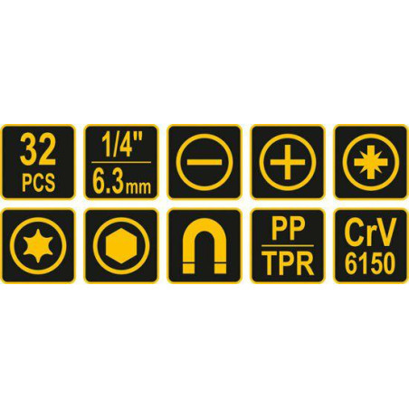 7SPONAI: Plokšti: 4.0x75, 6.5x100, 8.0x150 PHILLIPS: PH1x75, PH2x100 POZIDRIV: PZ1x75, PZ2x100 1SZT. PRAILGINIMAS, 50 MM 6 VNT. TIKSLIEJI ATSUKTUVAI: PHILLIPS: 2,0x50MM, 2,5x50MM, 3,0x50MM, PHILLIPS: PH00x50, PH0x50, PH1X50MM 17vnt. SRIEGIKLIAI: 25MM: FILIPSINIAI: PH0, PH1, PH2, POZIDRIV: PZ0. PZ1, PZ2, TORX: T10, T15, T20, T25, T30, ŠEŠIAKAMPIAI: H2, H2.5, H3, H4, H5, H6 MEDŽIAGA :CR-V, RANKENA---PP+TPR