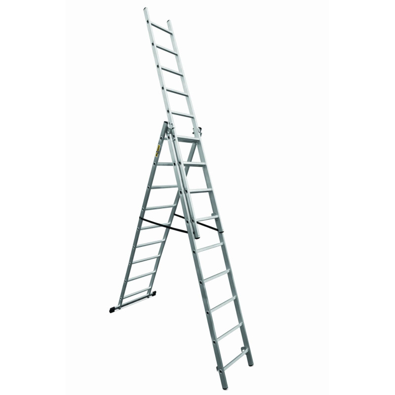 Lengva aliuminio konstrukcija Tvirti statramsčiai Galima naudoti kaip stovimas, laisvai pastatomas ir trečias kopėčių pratęsimas Neslystančios, pusapvalės prispaudimo kojelės Patobulinta prisukama stabilizatoriaus juosta Štampuotos pakopos Papildomas bamperio strypas, kad būtų galima lengvai pastatyti laisvai pastatomas kopėčias Tvirti fiksatoriai ir automatinis fiksavimo mechanizmas užtikrina visišką bet kokios konfigūracijos kopėčių stabilumą TÜV Rheinland saugos sertifikatas Apkrovos galia 150 kg