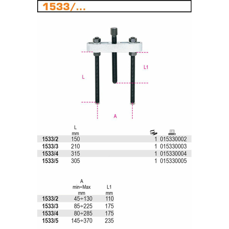 Beta 1533 Atskirtuvų traukikliai Beta 1534 Dviejų rankų traukiklis su fiksatoriumi, užtikrinančiu, kad traukiklio letenos neatsiskirtų. Skirtas mažiems guoliams, pvz., generatorių ir automobilių valytuvų svirčių, išmontuoti. Pagamintas iš aukštos kokybės grūdinto plieno.
