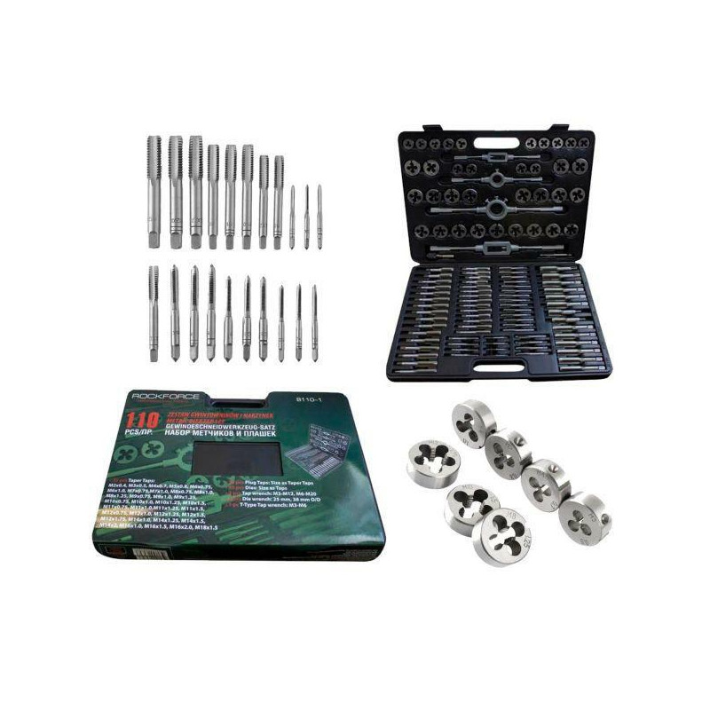 Į RINKINUKĄ Įeina: - 35 x 2 vnt. tokių pačių matmenų sriegiklių ir 35 štampų: - M2x0,4 mm - M3x0,5 mm - M4x0,7 mm - M5x0,8 mm - M6x0,75 mm - M6x1,0 mm - M7x0,75 mm - M7x1,0 mm - M8x0.75 mm - M8x1,0 mm - M8x1,25 mm - M9x0,75 mm - M9x1,0 mm - M9x1,25 mm - M10x0,75 mm - M10x1,0 mm - M10x1,25 mm - M10x1,5 mm - M11x0,75 mm - M11x1,0 mm - M11x1,25 mm - M11x1,5 mm - M12x0.75 mm - M12x1,0 mm - M12x1,25 mm - M12x1,5 mm - M12x1,75 mm - M14x1,0 mm - M14x1,25 mm - M14x1,5 mm - M14x2,0 mm - M16x1,0 mm - M16x1,5 mm - M16x2,0 mm - M18x1.5 mm - Reguliuojamas rankinis ratukas sriegimo įrankiams M3-M12, M6-M20 - 2 vnt. - Rankinis ratukas sriegimo įrankiams 25 mm, 38 mm O/D - 2 vnt. Viskas supakuota į patogų ir tvirtą plastikinį dėklą, kad atidarius dėklą dalys neišbyrėtų.