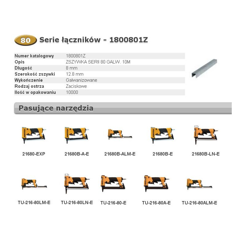 Užsakymo numeris 1800801Z Aprašymas SERIES 80 GALW. 10M Ilgis 8 mm Sąvaržos plotis 12,8 mm Apdaila cinkuota Geležtės tipas Užspaudžiamos Kiekis pakuotėje 10000 Montavimo įrankiai 21680-EXP 21680B-A-E 21680B-ALM-E 21680B-E 21680B-E 21680B-LN-E TU-216-80-E TU-216-80A-E TU-216-80ALM-E TU-216-80LM-E TU-216-80LN-E TU-216-80LN-E