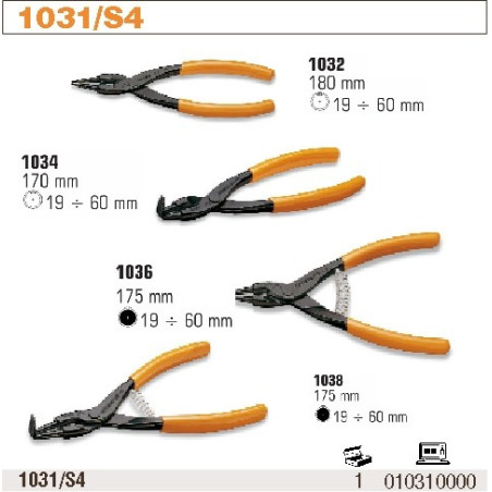 4 Beta 1031/S4 fiksavimo replės, kurias sudaro: Vidinės lenkimo replės tiesios 180 mm, 19-60 mm Vidinės lenktos 170 mm, 19-60 mm Išorinės lenkimo replės tiesios 175 mm, 19-60 mm Išorinės lenktos 175 mm, 19-60 mm