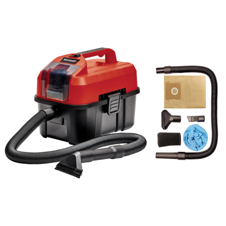 10 litrų talpos bakas Ergonomiškas dizainas ir nešiojimo rankena, kad būtų lengva transportuoti Galima siurbti sausu ir šlapiu būdu Į komplektą įeinančius priedus galima laikyti tam skirtose laikymo vietose Lengvai ištuštinti baką dėl greito nuėmimo spaustukų Tylus variklis (72 dB), kad būtų patogu dirbti tyliai Į komplektą įeina 2 metrų ilgio siurbimo žarna Į komplektą įeina 2-in-1 siaurinimo antgalis ir šepetys bei universalus apmušalų antgalis Į komplektą įeina putų filtras šlapiam siurbimui, Filtro maišelis ir popierinis maišelis Tiekiama be akumuliatoriaus ir įkroviklio (reikia įsigyti atskirai)