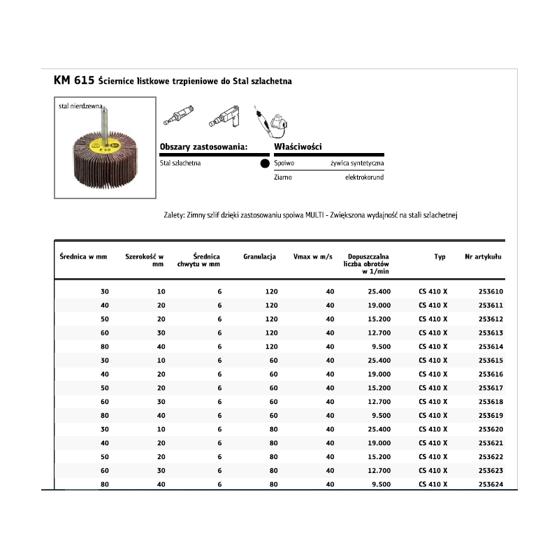 Panaudojimo sritys: - Nerūdijantis plienas - Universalus metalas - Mediena - Plastikas Savybės: rišamoji medžiaga: sintetinė derva Smėlis: elektrokorundas Privalumai: - Universalus produktas plienui ir nerūdijančiam plienui apdirbti - Vienodos eksploatacinės savybės - Tinka apdirbti sunkiai prieinamose vietose