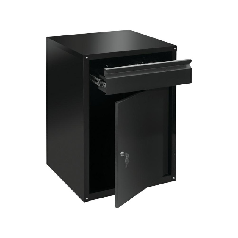 Produkto aprašymas Dirbtuvių spinta, padedanti palaikyti tvarką garaže, dirbtuvėse ar automobilių servise. Spintelė pagaminta iš juodai lakuoto plieno lakšto. Dėl elegantiškos apdailos ji tinka bet kokioms dirbtuvėms. Ji leidžia sukurti patogią darbo vietą ir užtikrina saugų įrankių laikymą. Spintelę sudaro korpusas su durelėmis su raktine spyna ir vienas tvirtas stalčius ant rutulinių guolių šliaužiklių. Spintelės matmenys: - Bendras aukštis: 775 mm - Bendras plotis: 525 mm - Bendras gylis: 485 mm Stalčiaus matmenys: - Vidinis stalčiaus gylis: Vidinis stalčiaus plotis: 430 mm: 420 mm - vidinis stalčiaus aukštis: maksimali stalčiaus apkrova: 125 mm: Maksimalus šulinio stalviršio svoris - 20 kg