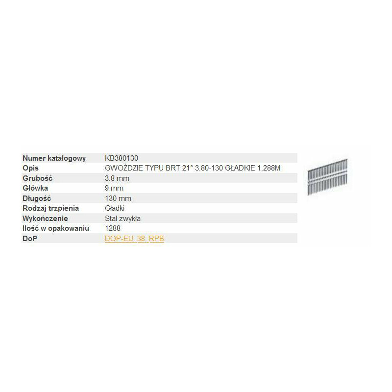 Tvirtinimo detalių serija - KB380120 Užsakymo numeris KB380120 Aprašymas BRT 21° vinys 3.80-120 VINKLĖS 1.288M Storis 3,8 mm Galvutė 9 mm Ilgis 120 mm Koto tipas Lygus plienas Apdaila Pakuotė Kiekis 1288 Atitinkami įrankiai 5381312 BRT130-E